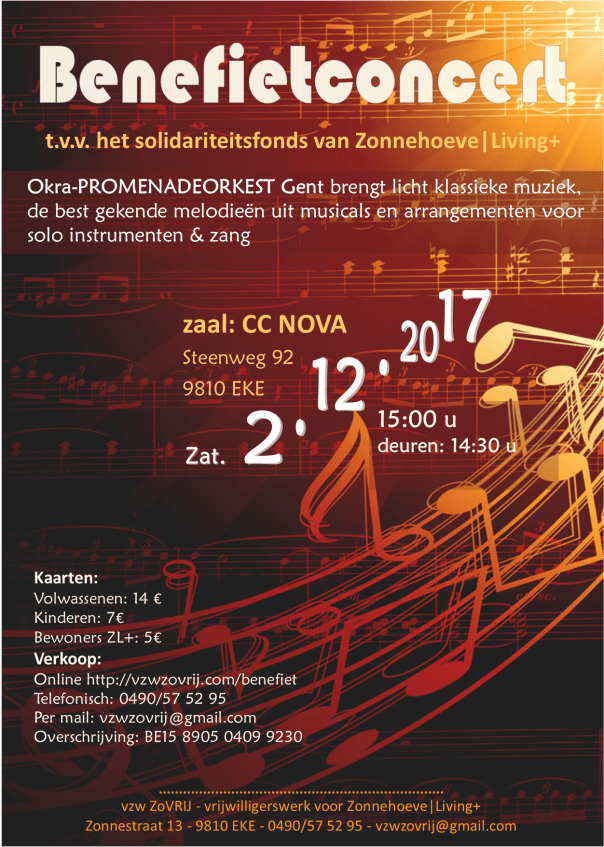 Ook vzw ZoVRIJ schiet nu al in actie voor de Warmste Week van ’t jaar. We kiezen voor muziek en plannen een Benefietconcert op zaterdag 2 december om 15 u. Het Okra-PROMENADEORKEST Gent brengt licht klassieke muziek, de best gekende melodieën uit musicals en arrangementen voor solo instrumenten & zang. Een muzikale aanrader waarvan de opbrengst integraal naar het solidariteitsfonds van Zonnehoeve|Living+ (voorziening voor volwassen personen met verstandelijke beperking) gaat. Dit evenement is een erkende actie van Music for Life!